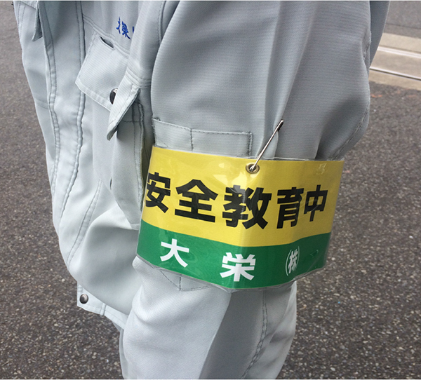 写真:「安全教育中」の腕章と安全大会の実施
