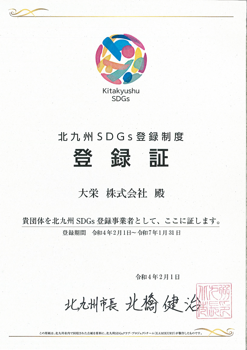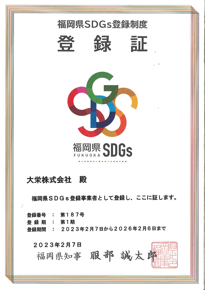 当社は令和4年度2月1日付で北九州SDGs登録事業者として、令和5年2月7日付で福岡県SDGs登録事業者として登録されております。以下の取組を行い、持続可能な社会の実現に貢献してまいります。